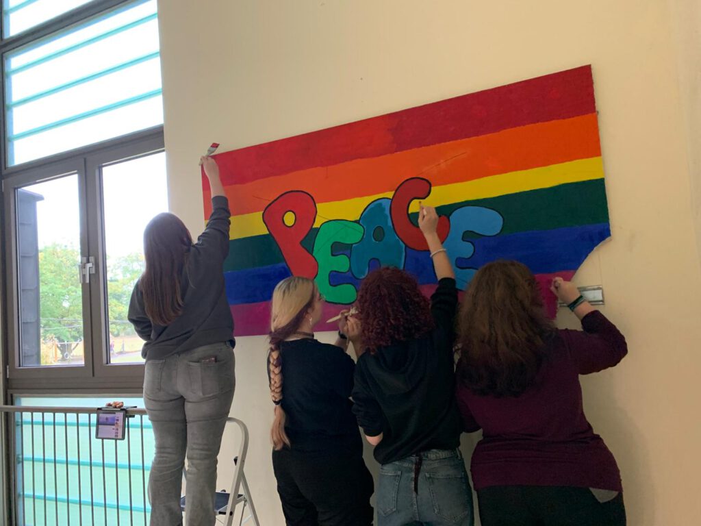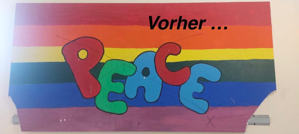 Das Team von Schule ohne Rassismus – Schule mit Courage hat dem „Peace“-Bild in Gebäude B einen frischen Anstrich verliehen. Das Bild wurde von ehemaligen Schülerinnen gemacht und wurde leider mehrere Male verschmiert. Dabei ist die Botschaft doch sehr schön und wichtig: „Jede und jeder ist wertvoll und wir möchten mit all unseren Unterschieden gemeinsam in Frieden leben.“